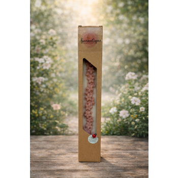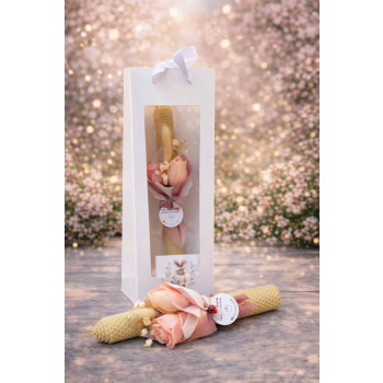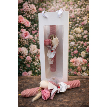 Η λαμπάδα αυτή είναι 100% χειροποίητη, φτιαγμένη από αγνό μελισσοκέρι. Στολισμένη με υπέροχα αρωματικά λουλούδια σόγιας που χαρίζουν κομψότητα και φινέτσα και αργότερα μπορούν να χρησιμοποιηθούν ως wax melt. Είναι ιδανική επιλογή για δώρο καθώς έρχεται με το δικό της κουτί και είναι φτιαγμένη με πολύ αγάπη.