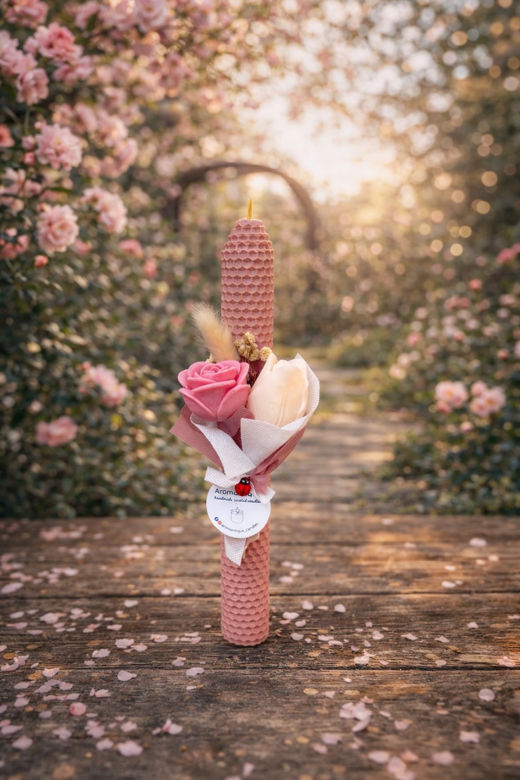 Η λαμπάδα αυτή είναι 100% χειροποίητη, φτιαγμένη από αγνό μελισσοκέρι. Στολισμένη με υπέροχα αρωματικά λουλούδια σόγιας που χαρίζουν κομψότητα και φινέτσα και αργότερα μπορούν να χρησιμοποιηθούν ως wax melt. Είναι ιδανική επιλογή για δώρο καθώς έρχεται με το δικό της κουτί και είναι φτιαγμένη με πολύ αγάπη.